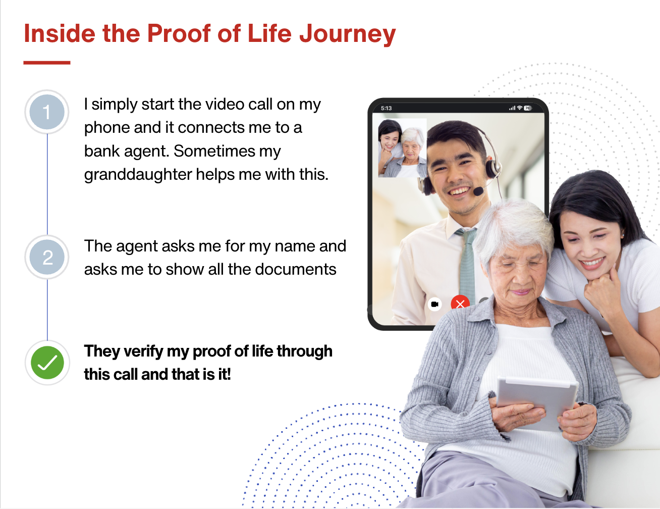 Ever since the bank introduced video call verification for my proof of life certificate, I am able to complete the procedure in less than 5 minutes, right from my house. It's very easy to start the video call, and I only need to show my documents on call while an agent verifies it for me!